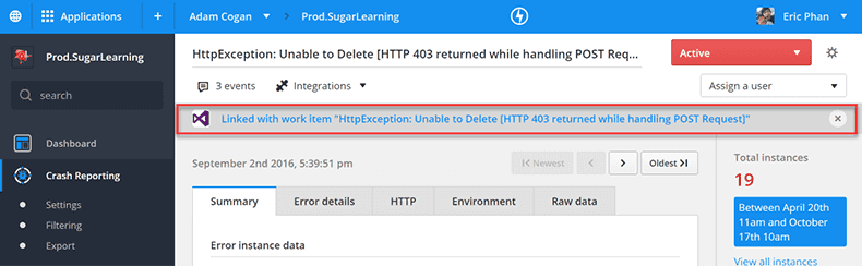 Figure: Link RayGun with TFS/VisualStudio.com Now under the crash report, you have to option to create a PBI and link it to the crash report.