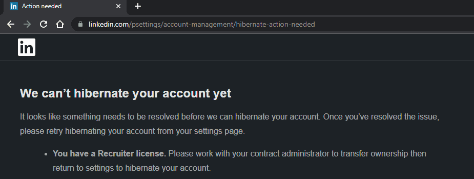 Figure: LinkedIn doesn’t let you disable/hibernate an account that has a Recruiter License The only workaround is to make your secondary account more obvious by adding a clear description:
