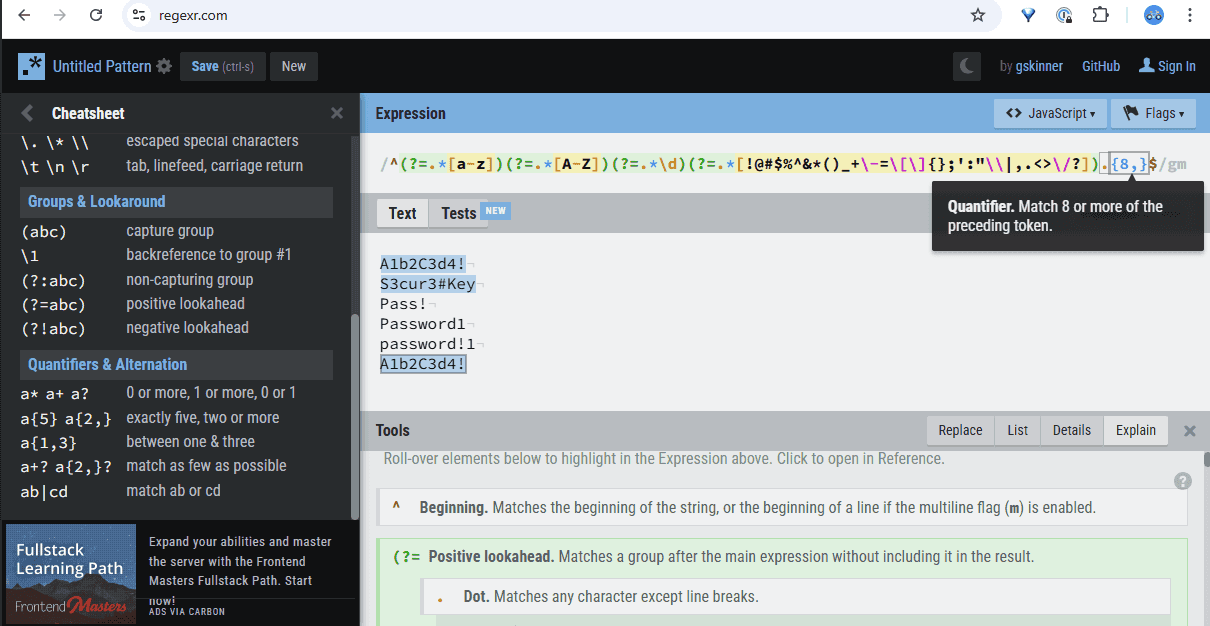 import re # Define the regex pattern for validating passwords pattern = r"^(?=.*[a-z])(?=.*[A-Z])(?=.*\d)(?=.*[!@#$%^&*()_+\-=\[\]{};':\"\\|,.<>\/?]).{8,}$" # List of passwords to validate passwordList = [ "A1b2C3d4!", "S3cur3#Key", "Pass!", "Password1", "password!1", "A1b2C3d4!" ] # Loop through the passwords and use re.search to validate them for password in passwordList: if re.search(pattern, password): print(f"Valid: {password}") else: print(f"Invalid: {password}")Valid: A1b2C3d4! Valid: S3cur3#Key Invalid: Pass! Invalid: Password1 Invalid: password!1 Valid: A1b2C3d4!Figure: Writing and testing regex directly in your code without live validation