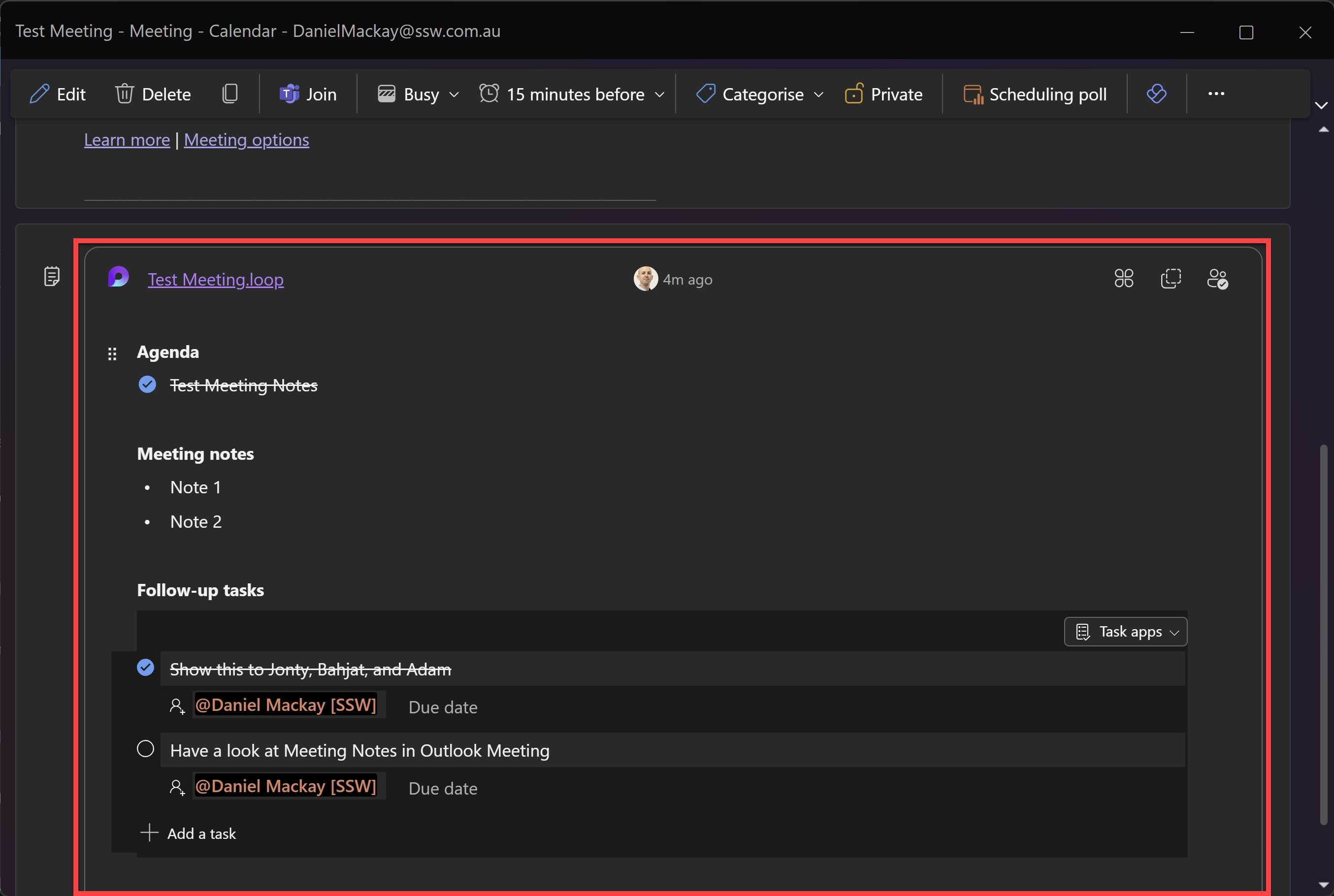 After the meeting, once you’ve created PBIs (Product Backlog Items) or other tasks based on the notes, include a link to the corresponding PBIs and remember to “zz” (mark as obsolete) the Loop notes.