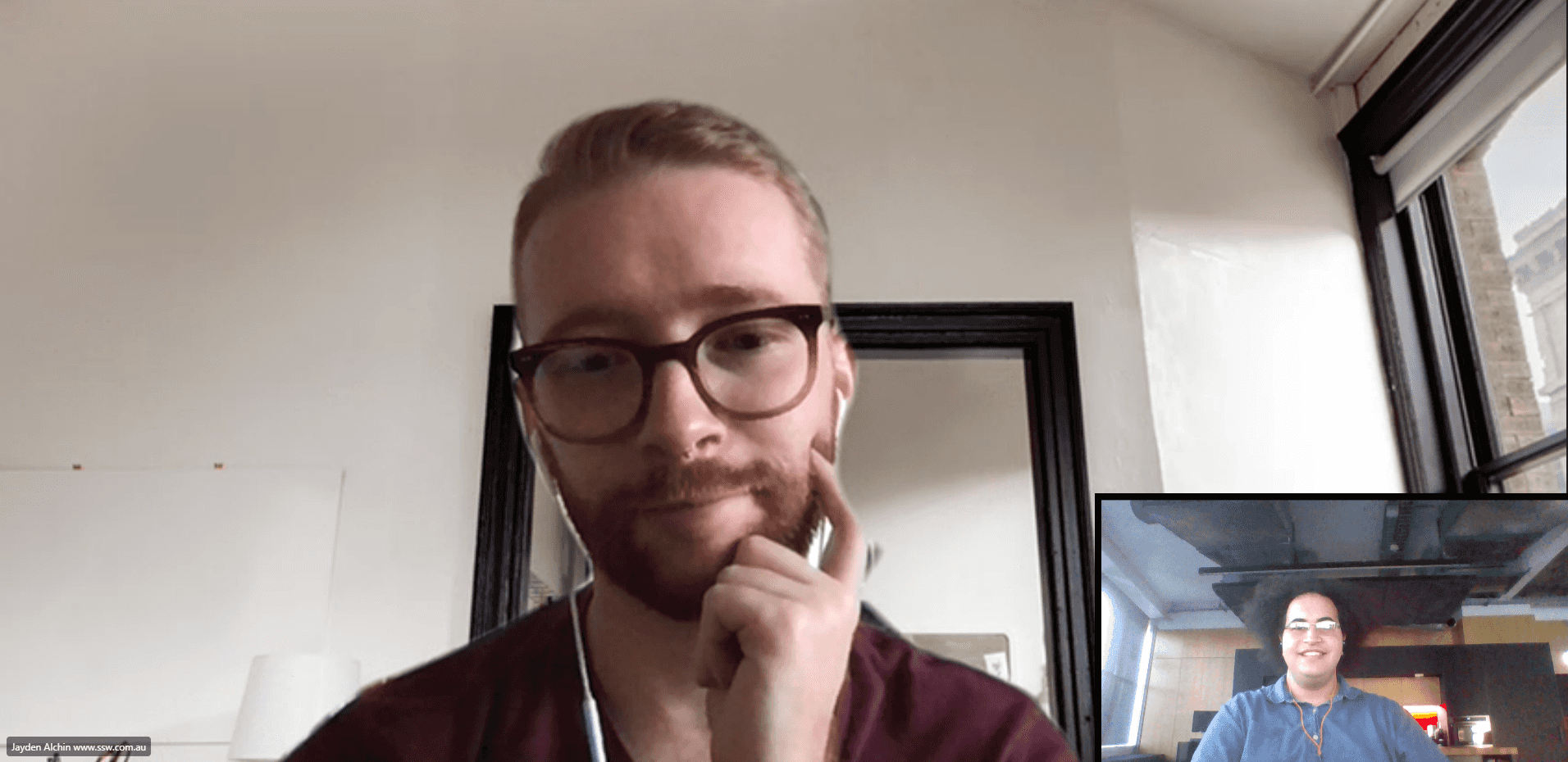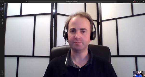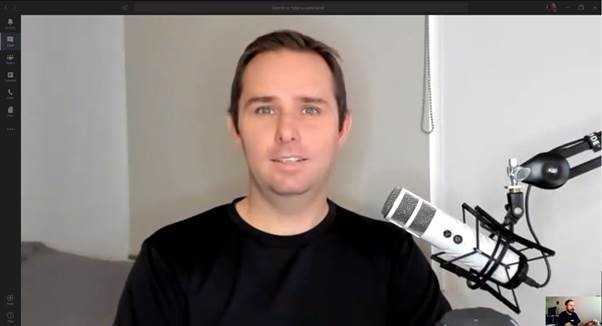 Figure: Jason is in a bedroom, however, the angle shows little of the bed In this setup, Jason is using a more ‘pro’ setup with a USB powered podcasting mic and an articulating arm. He is also using a high-quality webcam with a ring light.