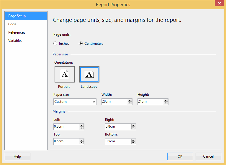 - Change the report's page width to 28cm (or 11in) and top and bottom margins to 0.5cm.