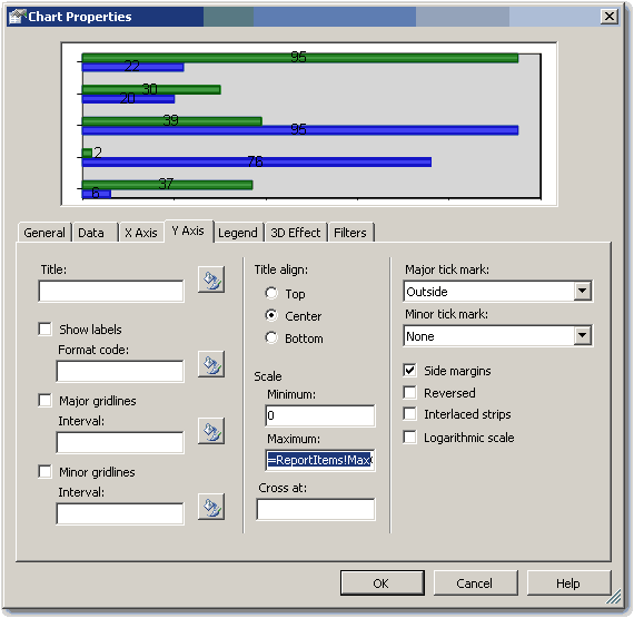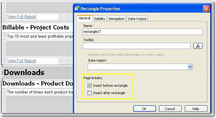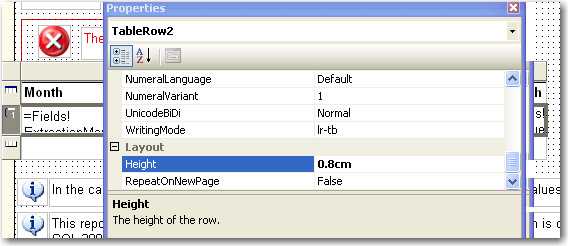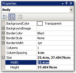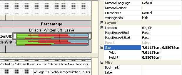 - Resize report items (tables and charts) to fit the page. The easiest way to do this is to select (Ctrl+click) all report items that should span the whole width of the page, and set their Width property to 25.4cm (or 10in).