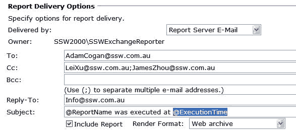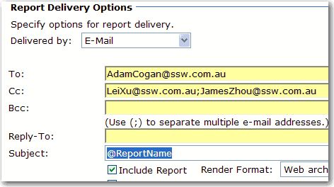 Figure: Good example - Subject same as report name You can get email list in ExtensionSettings, which is an XML column in Subscriptions table in database of reporting services. Subscriptions table has a FK with Catalog table, which contains report name and report path information. Then we can XQuery the ExtensionSettings to get TO and CC fields according to report name and report path.