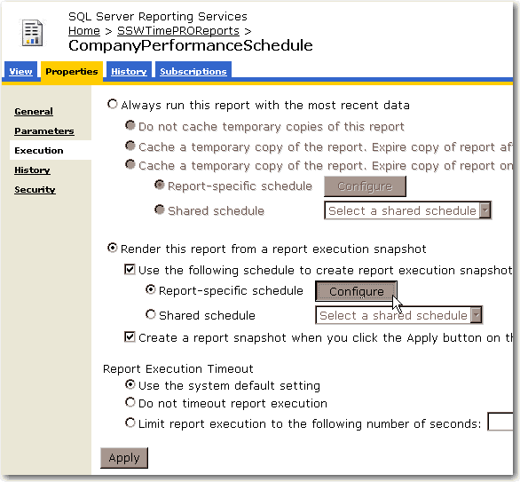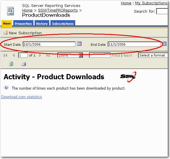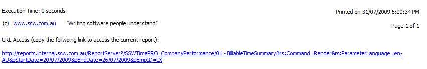 http://localhost/ReportServer/Pages/ReportViewer.aspx?%2fSSWTimePRO_CompanyPerformance%2f01+-+BillableTimeSummary&rs:Command=RenderBad example - Only refer to the default report URL, parameters on the report will be lost