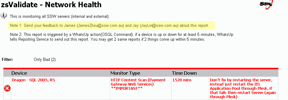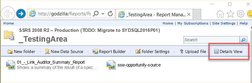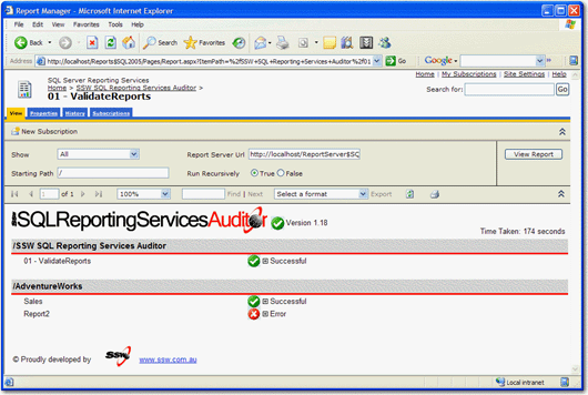 Figure: SSW SQL Reporting Services Auditor SSW SQL Reporting Services Auditor is Web-Application that iterates through all the reports on a report server and shows whether they have rendered correctly or if any errors occurred.