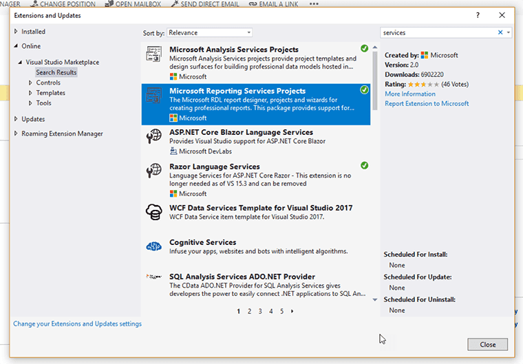 Figure: Checking Microsoft Reporting Services Projects is installed - In SQL Server Data Tools (SSDT) for Visual Studio website you will find all the instructions to install the tool via Marketplace or SSDT standalone installer.