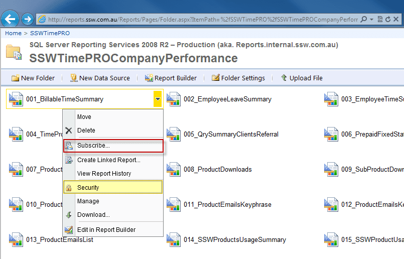 Figure: Reports folder view - Click the report you're going to subscribe and select "Subscribe...".