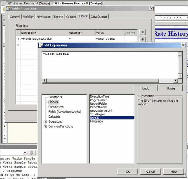 Figure: Specify the filters on your data table and select Globals->User!UserID Note: 'Edit Expression' dialog is only available on RS 2005, but the UserID global variable is available on RS 2000.