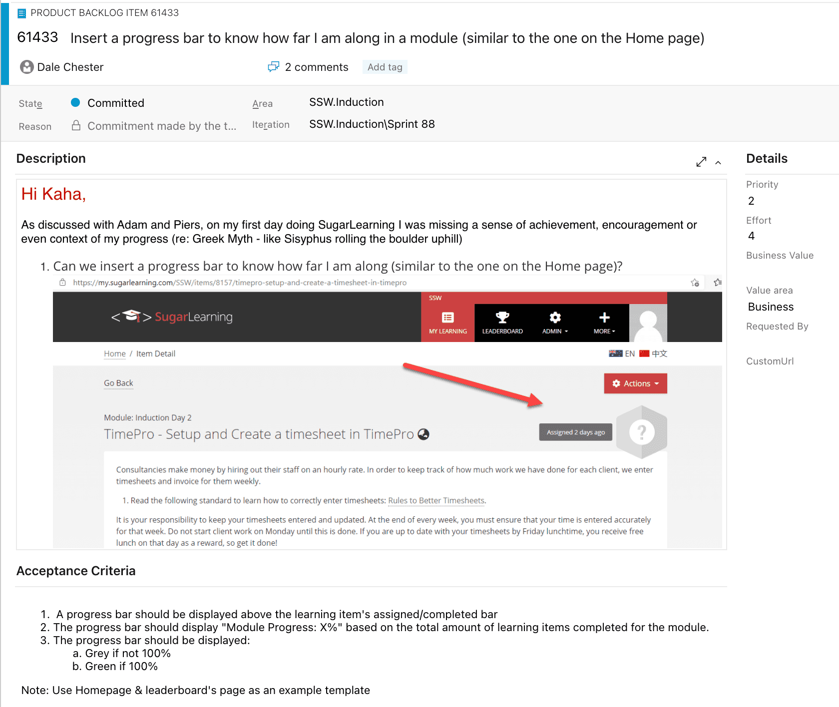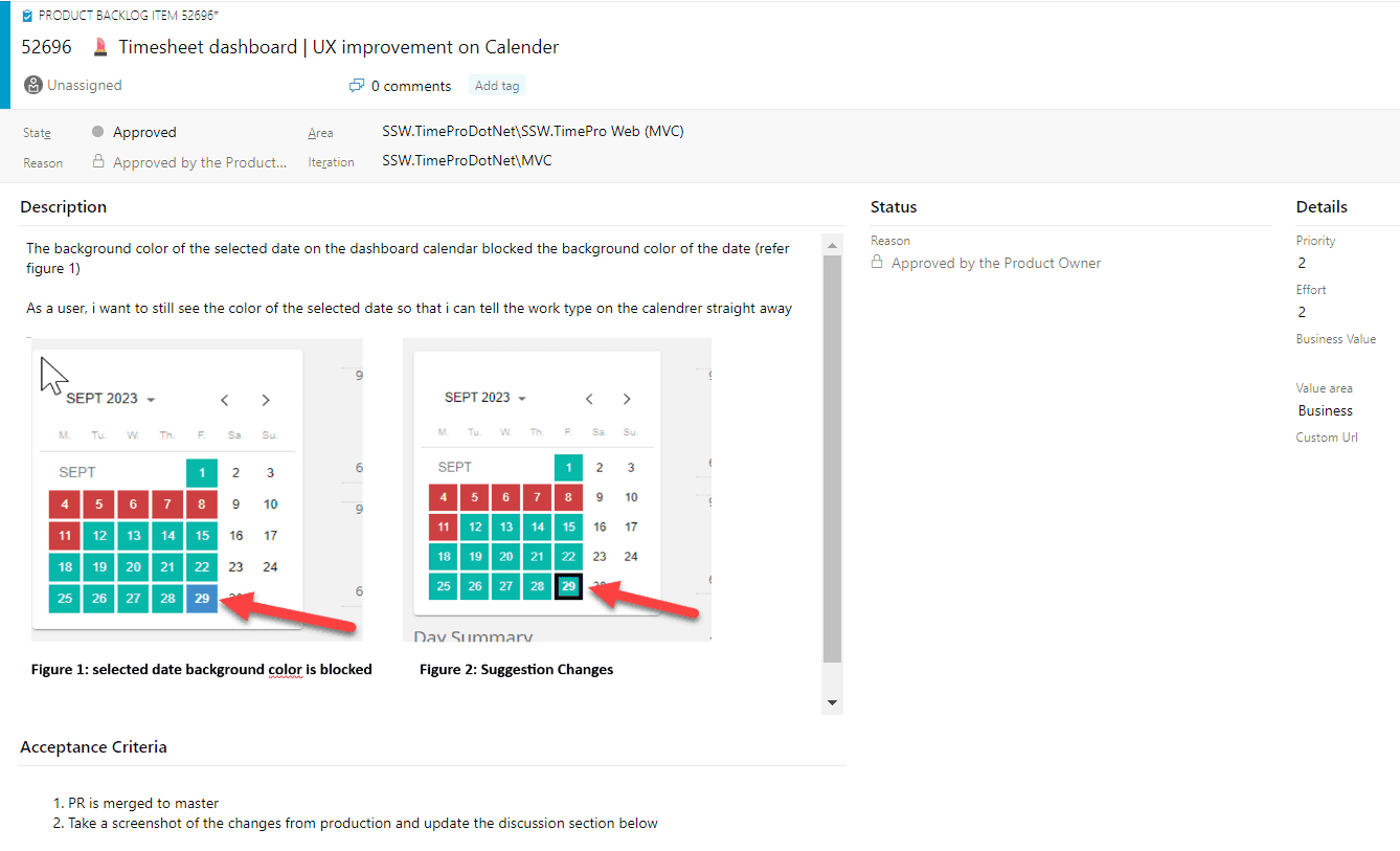 Note: For tiny PBI, you can omit Acceptance Criteria. Sometimes you just need a screenshot or, even better, a video.
