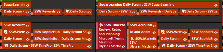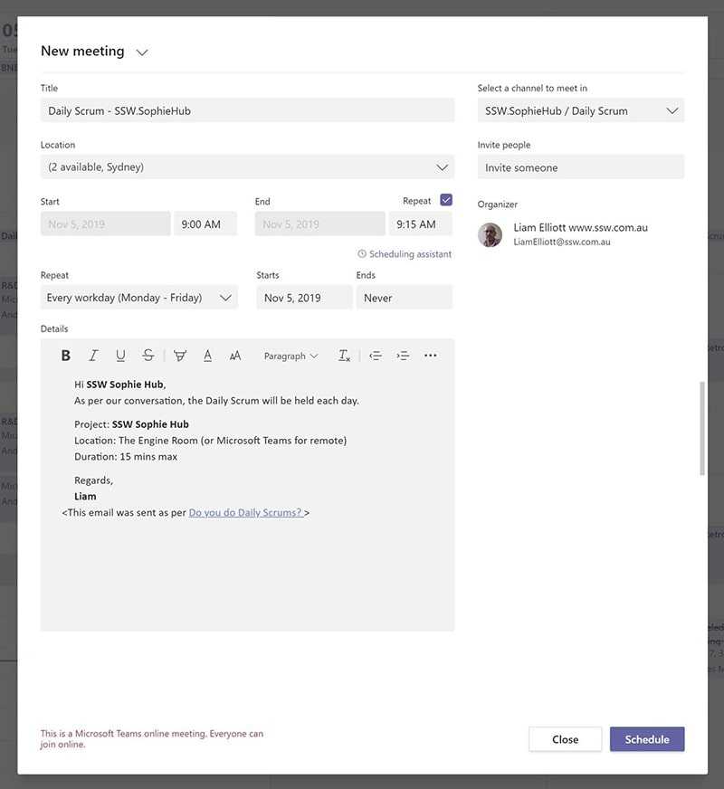 It is a great idea to run your Scrum meetings through Microsoft Teams, so that the whole team is invited and new developers can easily find the meetings Tip: See more information on when to send an Appointment or a Teams Meeting.