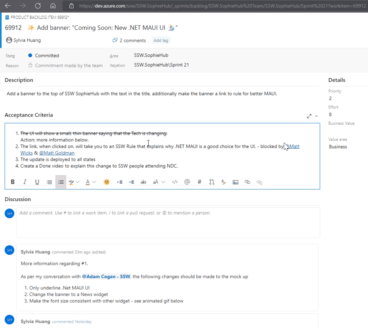 Any discussion that changes the PBI and/or the Acceptance Criteria should be noted in the Discussion section of the PBI for reference.