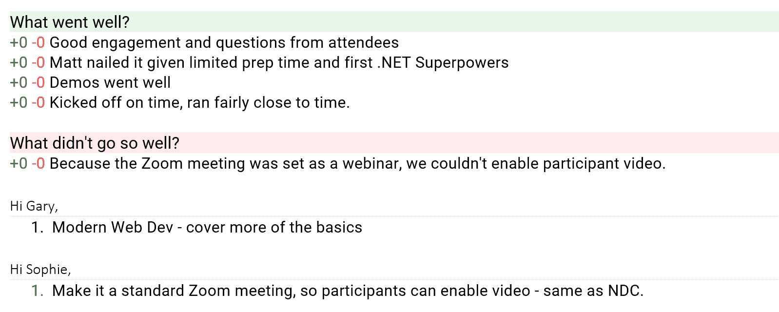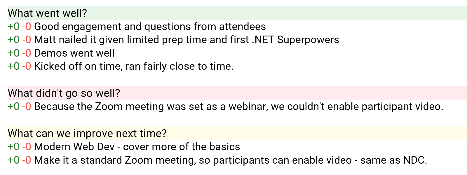 I'm recording the Sprint Review and Sprint Planning so I can get the Copilot stats. I'll stop the recording to do the Retro to give the recording time to save.