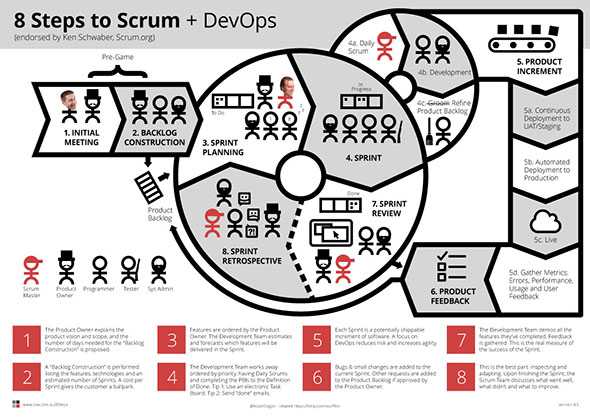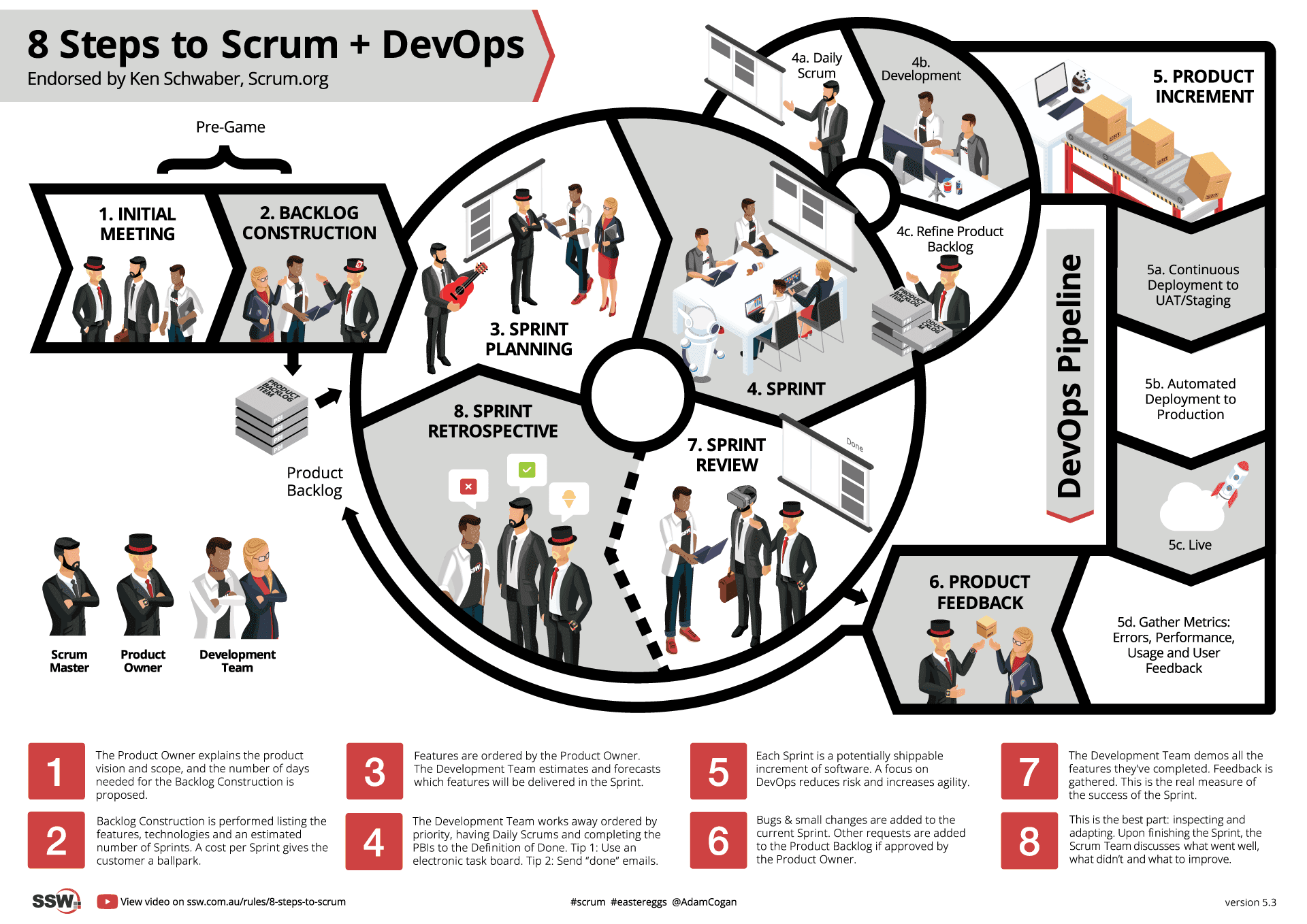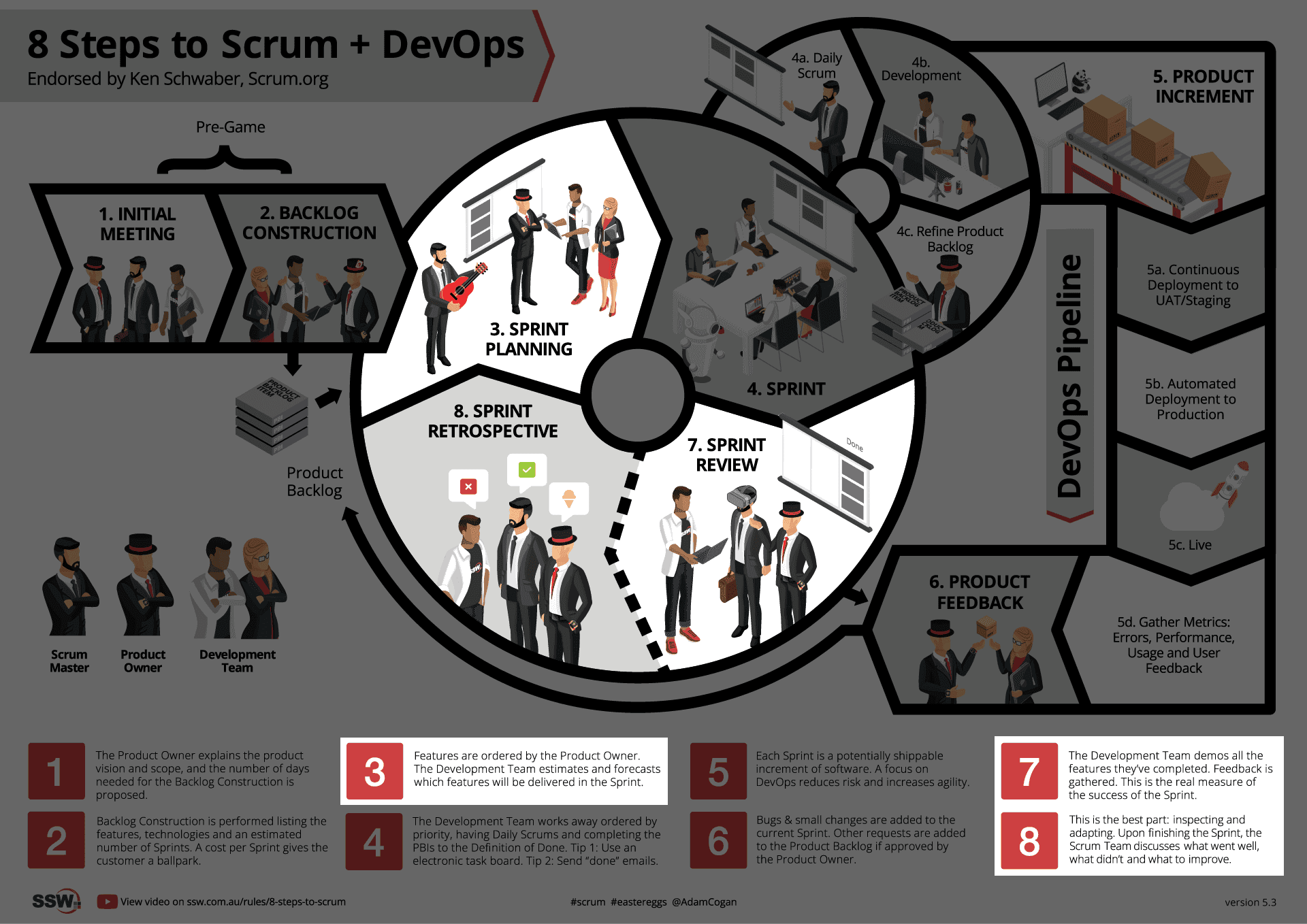 Figure: This Scrum image includes all the important steps from the Initial Meeting to the Sprint Review and Retro Print out the SSW 8 Steps to Scrum PDF and put it on your "War Room" wall.