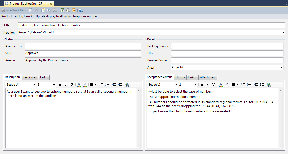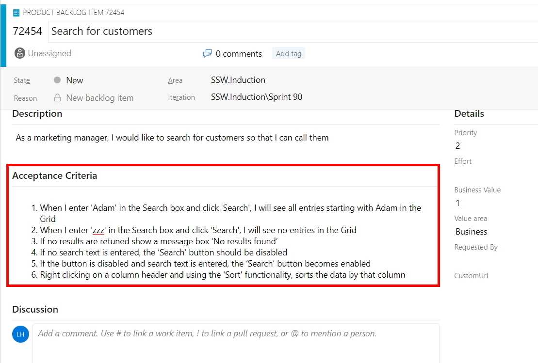 Figure: A PBI with Acceptance Criteria in Azure DevOps When I enter ‘Adam’ in the search box and click 'Search' I will see all entries starting with 'Adam' in the grid