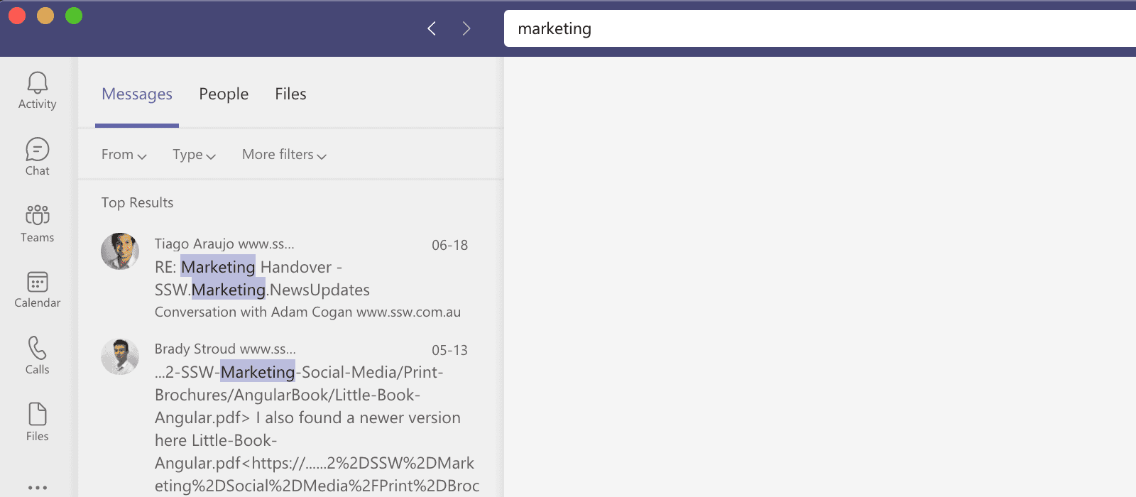 Figure: Search results for "marketing" Tip: Apart from the little heading, as per the image above, you can recognize a Teams result when it only shows up the title, while a Channel result shows the title with the name of the associated Team underneath.