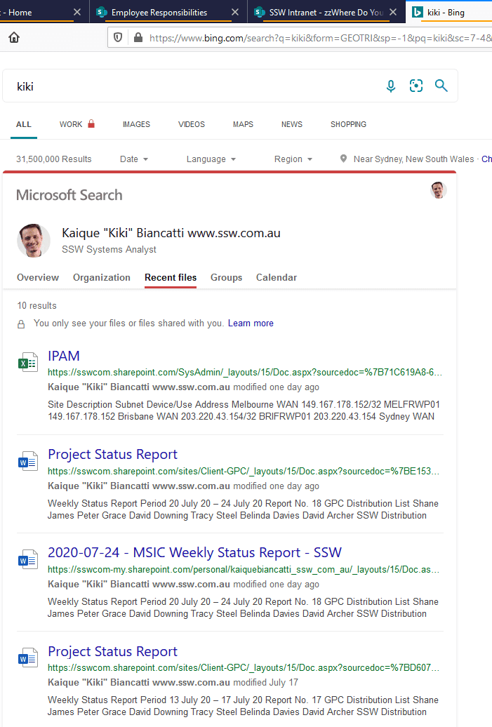 In Bing, if you are logged in to your work account, you can easily see your recent files!