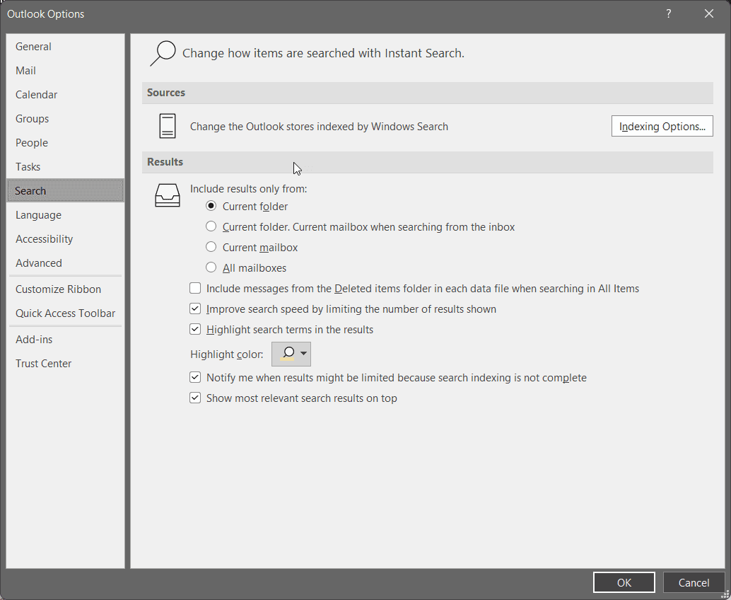 Figure: Outlook Options for Search, have been changed to “Current Folder” Tip #2: Focus on the person (i.e. to: from: cc: bcc:)