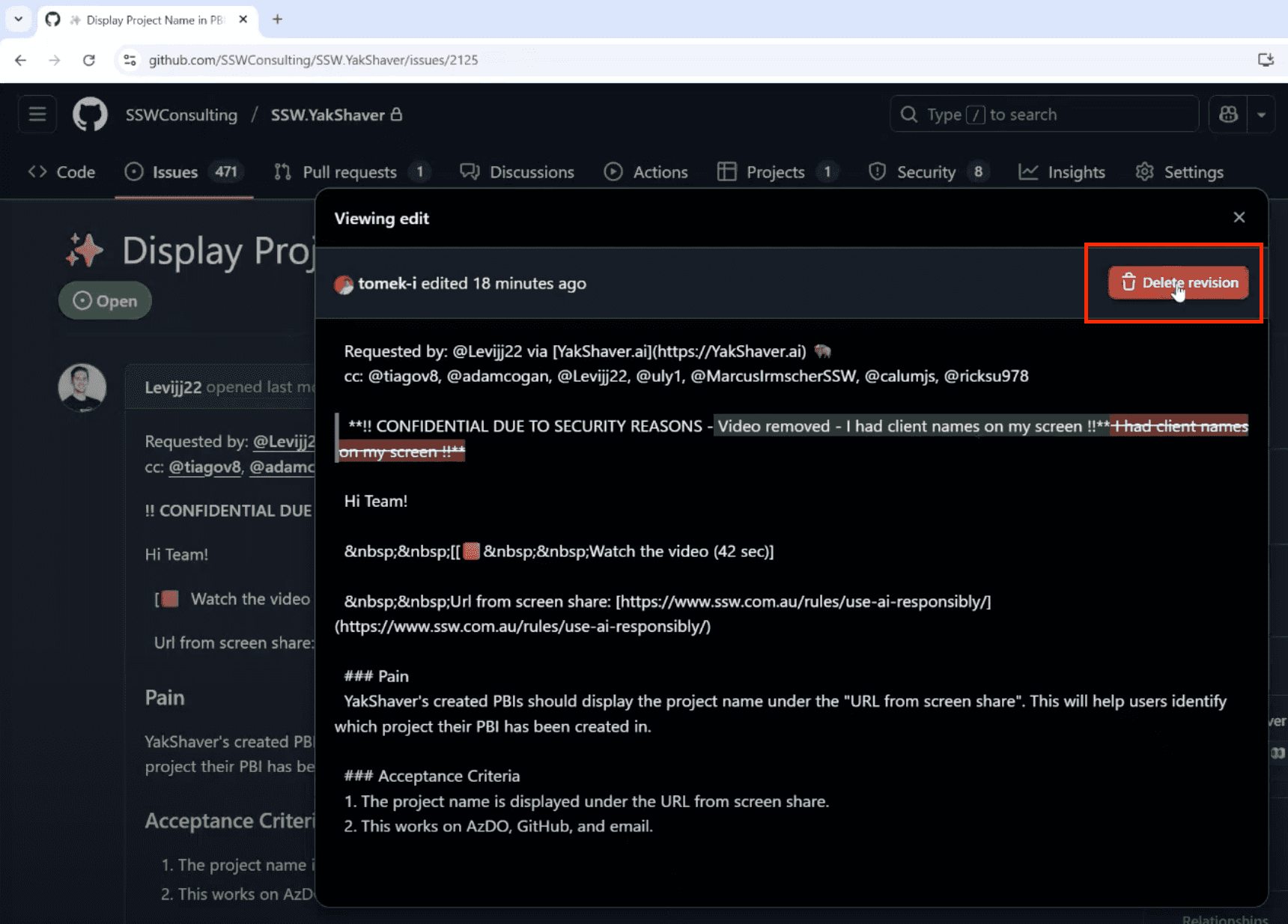 Immediately remove any visible confidential data from the issue body, comment, or image attachment. - Review all revisions