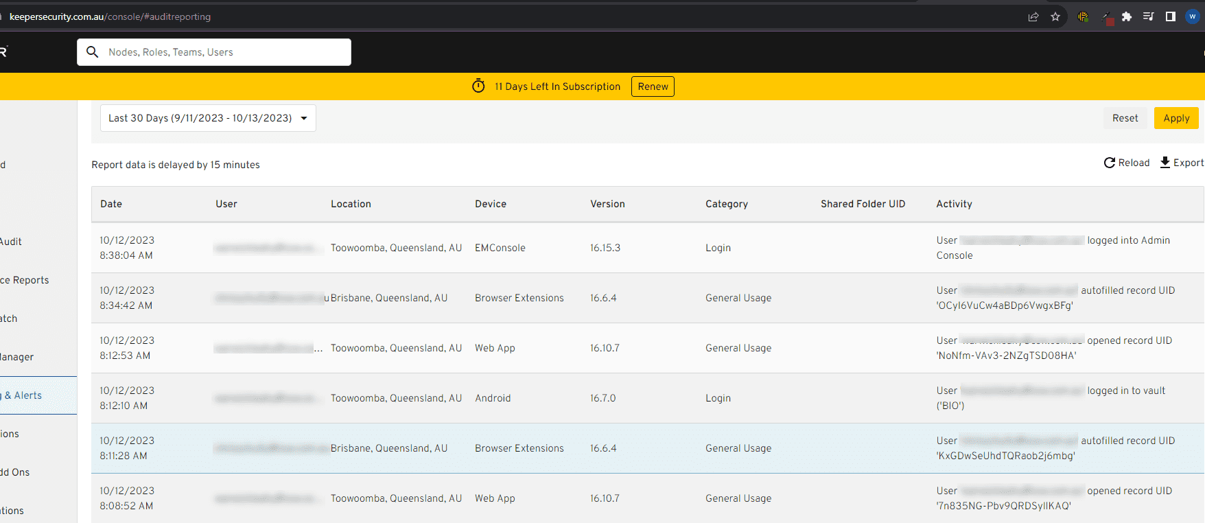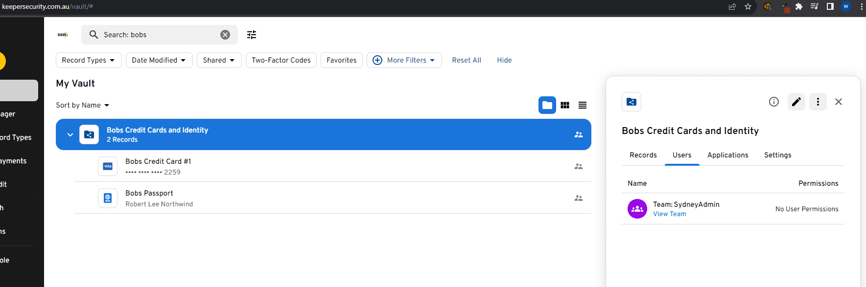 Figure: Keeper quickly shows you if any of your passwords have been released in a breach They also allow administrative control of your accounts. In an enterprise you should be able to transfer any non-shared passwords if a staff member leaves (in case they forgot to share them). Lock their account and expire their master passwords. This is great when a staff member leaves but also super important if they lose a device.