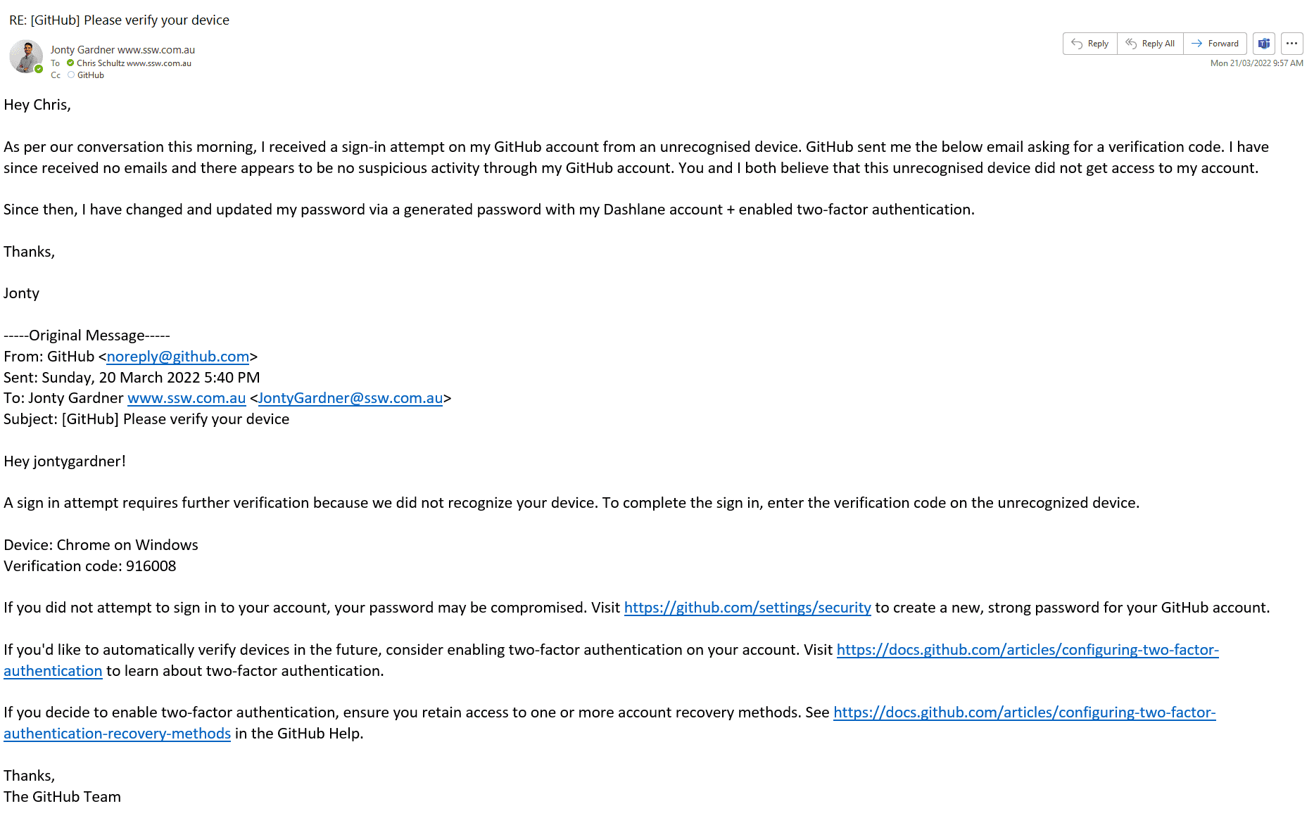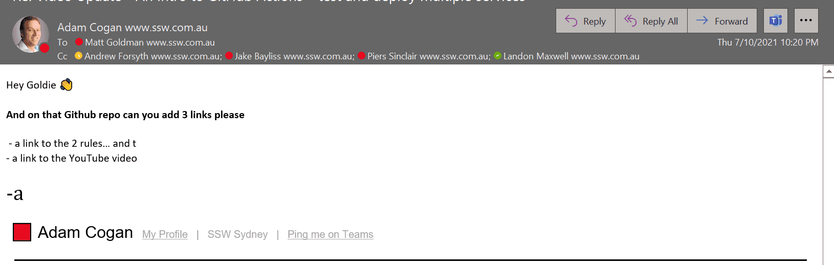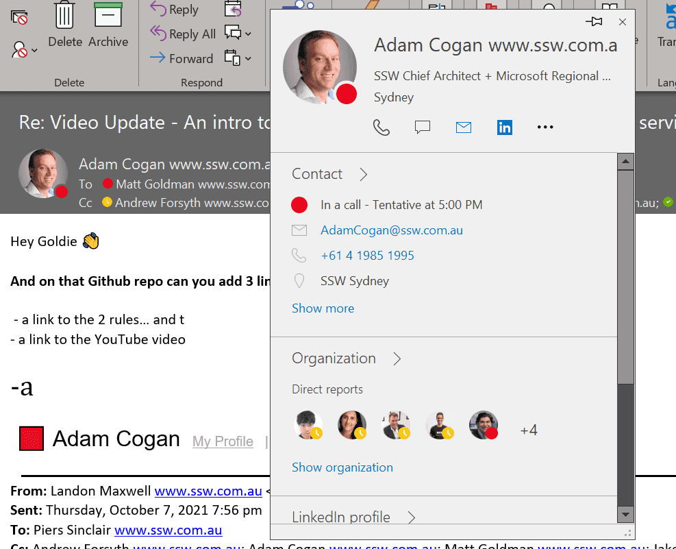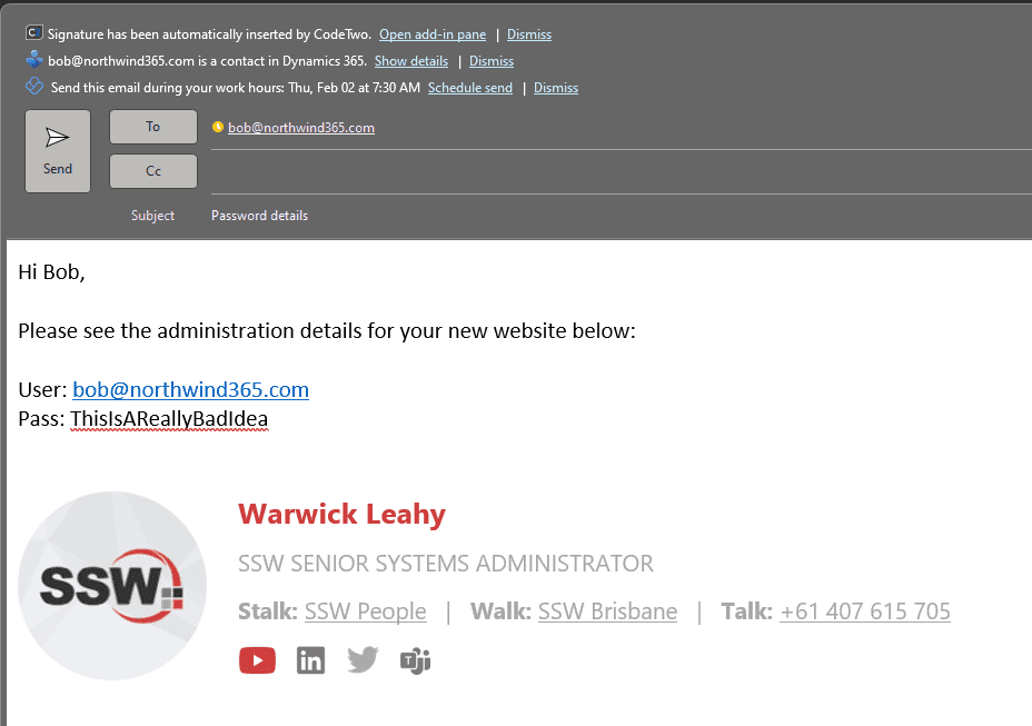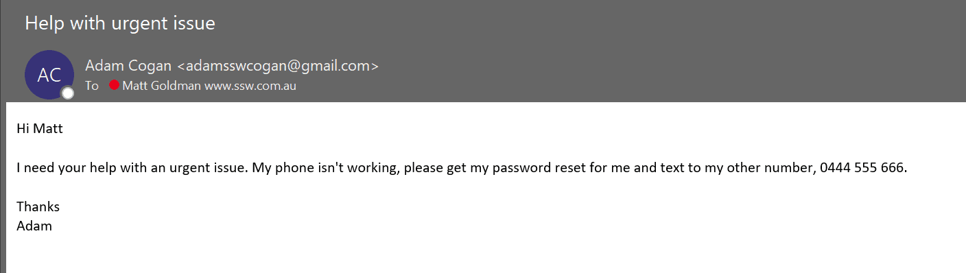 Good example – The email address is correct, and in this case as it’s internal, the sender’s profile picture is shown It’s important to note that this is just one tool in your arsenal. Attackers can spoof email addresses too, so if you have any doubts, you should ask your SysAdmins to help you check the message headers, or do a message trace for you. But an incorrect email address is a dead giveaway.