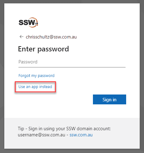 - Instead of typing your password, select Use an app instead or Other ways to sign in