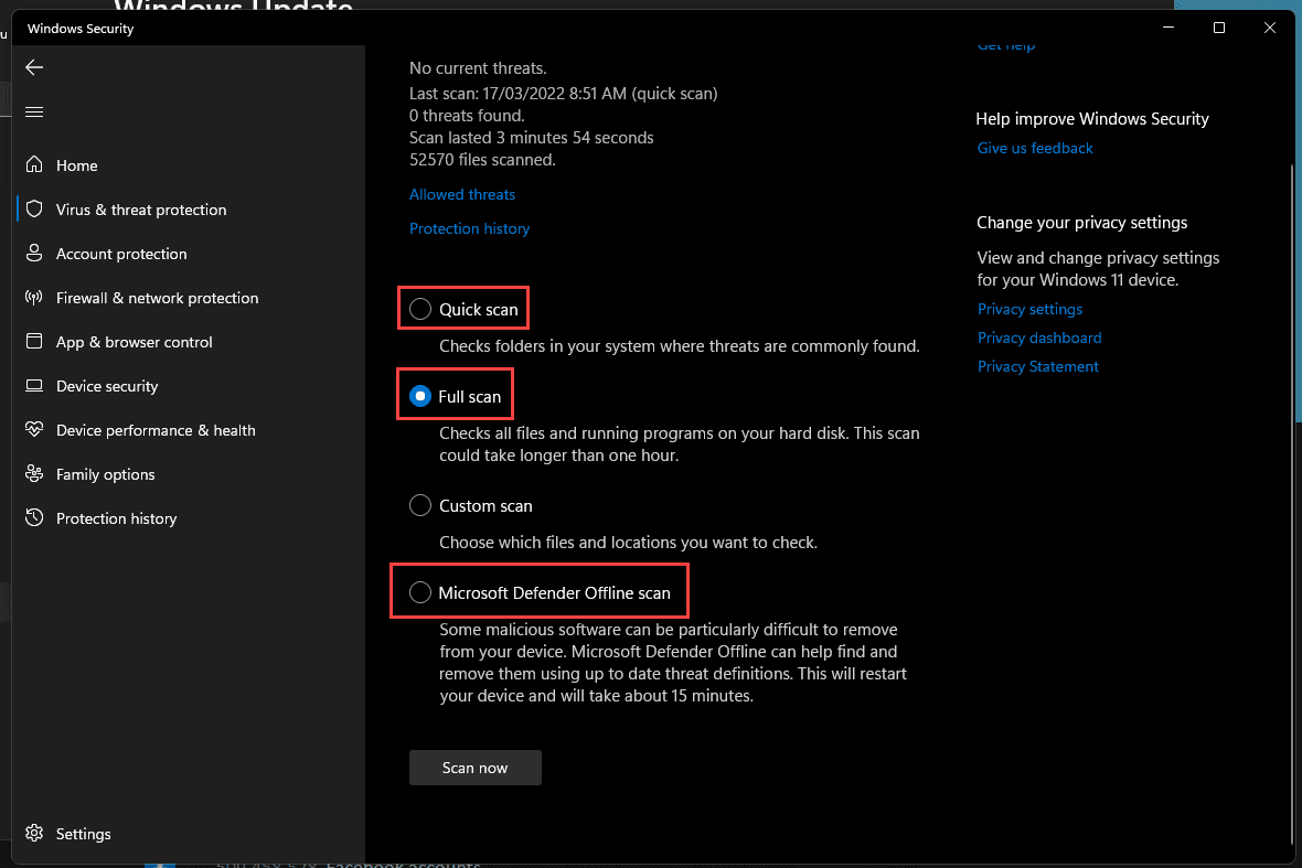 - Once you don't need to use your PC, run an offline scan - This scan will take your PC offline to do a scan and ensures viruses can't reinfect you during the quarantine process
