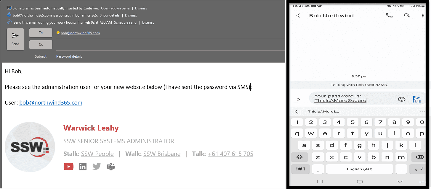 - Share the password via SMS/text - If all previous options fail, we try sharing the password via text. However, this method is much less secure and should only be used as a last resort, if used at all, due to the password being saved forever in an SMS. We advise using different mediums to share the password, e.g. username via a Teams message, password via SMS. The password should be changed after it's all done.