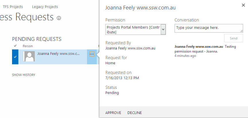 Figure: possible actions for requests (Approve, Decline or start a conversation with the request user) To setup permission request for a SharePoint site collection, go to " Site Settings (Gear Wheel icon) | Site Permissions ":
