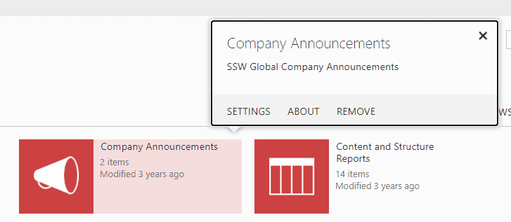 To remove company News, click “Settings” | “Remove” from Site Contents: