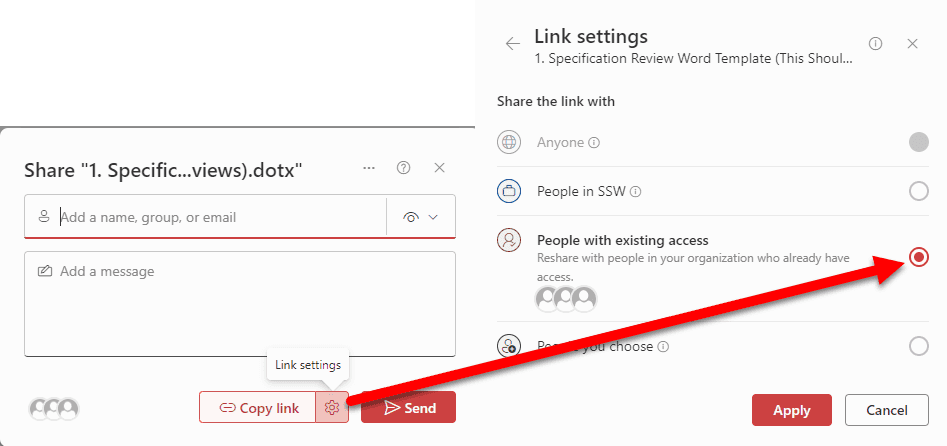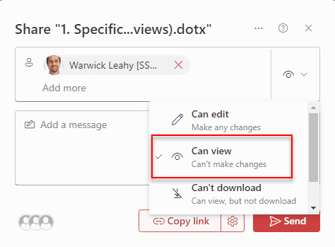 You may be tempted to share a link via the Share email invite. In doing so, the sharing permissions default to 'can view', which is fine if you are sharing the file externally. If you are sharing to someone who already has access to the file, it breaks permissions on the item you're sharing and creates a unique permission set for whoever you share it with. This means that a person who already had access to a file may find that using the shared link grants them different permissions. This makes it very difficult for SharePoint admins to maintain permissions!