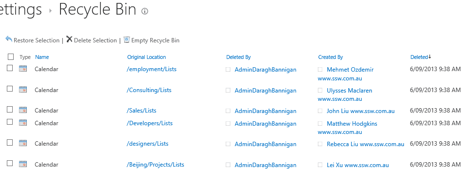 Figure: Empty Calendars in Recycle Bin folder One of the annoying things with SharePoint document and page libraries is that users often accidentally leave checked out files, that prevents others from modifying them.