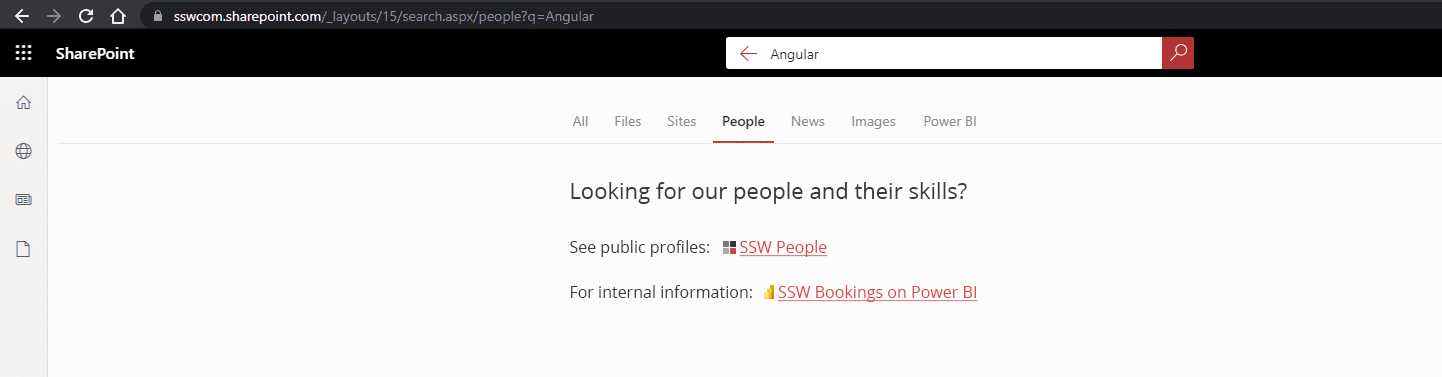 Figure: Searching User + Skill doesn’t yield any result although this skill is associated to the user Out of the box, SharePoint provides widgets (aka webparts) to style your link with a consistent look and feel. Standard left-navigation also supports emojis 💖.