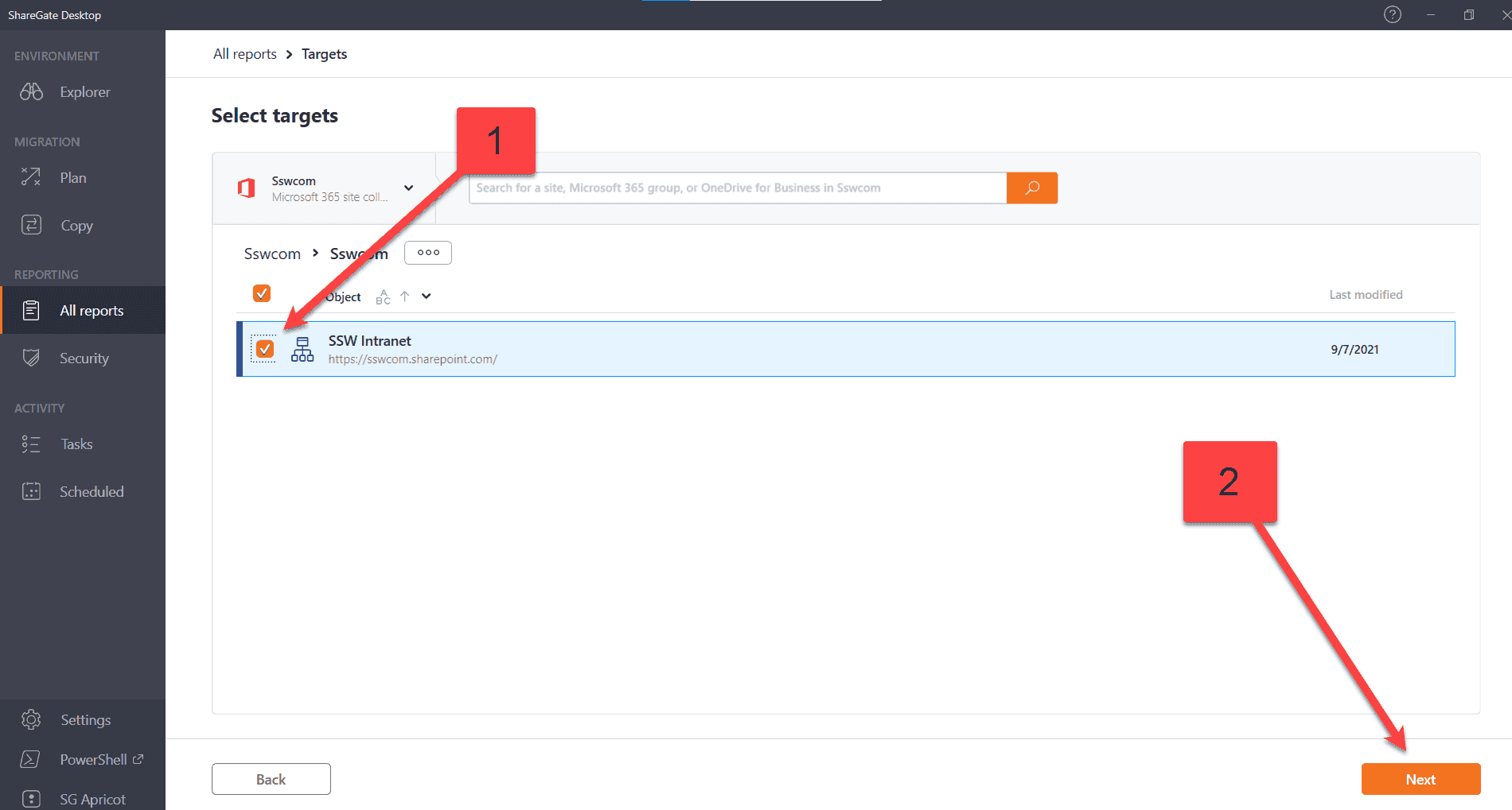 Figure: Choose navigate or tick - Under Navigate choose the individual site | Click Next