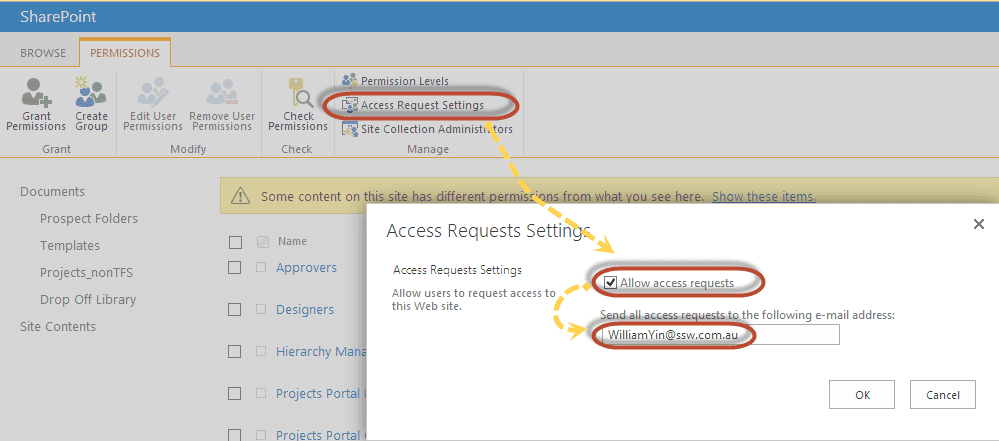 Figure: Open "Access Request" setting Limition: This "Access Request" only works for authenticated users to inquire more access permission, that means if your site allows "anonymous access", then an anonymous user cannot send "access request" as he doesn't have an identify to be assigned more access permission.