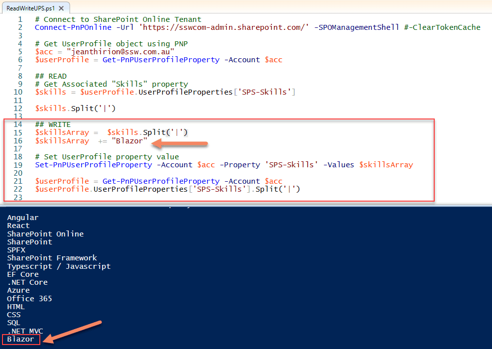 Figure: Powershell - Adding “Blazor” to Jean’s skill list OpenSearch is another solution, using the OpenSearch protocol you can add external data sources to your SharePoint search results.