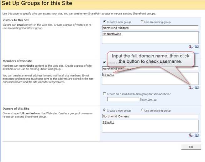 In this case, we are using 'create a new group' option because we want this group to be able to access only for this particular site - It is a good practice to create a new group for every site you create, because it will be easier to add or delete users in the group for that specific site.