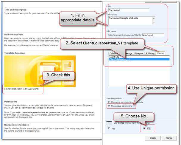 Note: Your selection is confirmed in the picture. In this example, the template’s description looks like “Site for Collaboration with SSW Clients”. - Select “Use Unique permissions” as you need to give the client an account to visit.