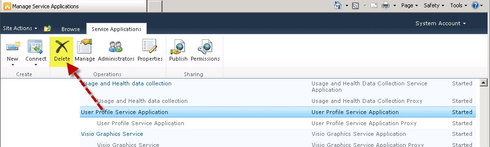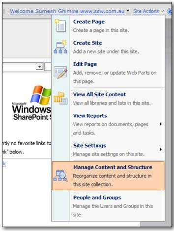 - Click "Site Actions" on right-hand top, select "Manage Content and Structure