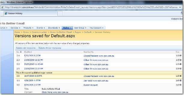 SharePoint also tracks changes across versions (except in web part zones), and allows users to compare between different versions.