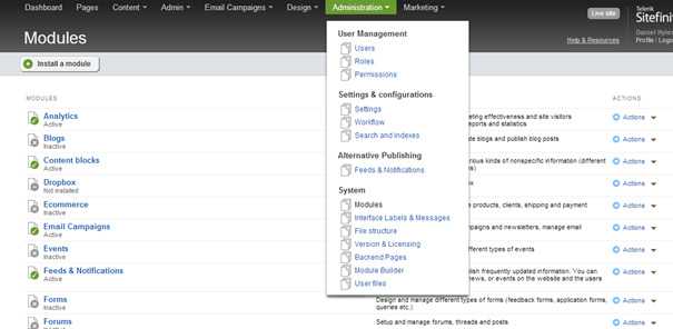 Figure: Administration -> System -> Modules - Ensure that the Sitefinity database is indexed and the Statistics are updated. This will ensure that the Sitefinity query's remain quick: Sitefinity Database maintenance