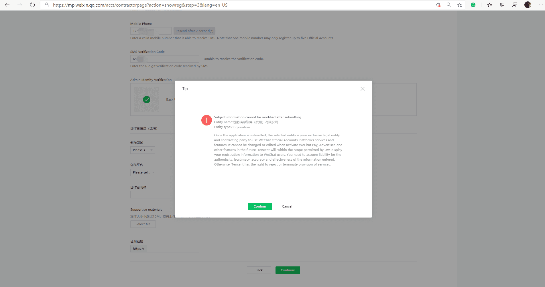 Figure:System will remind you that all the information you submitted cannot be changed afterwards - Pay the verification fee of CNY ¥ 300 (Approx. to AUD $60) to the specified account, waiting for 5-7 working days, and your WeChat Account is available. Login by your email and password on WeChat Official Accounts Page, you will go to your Office Account operation interface and start to use it.