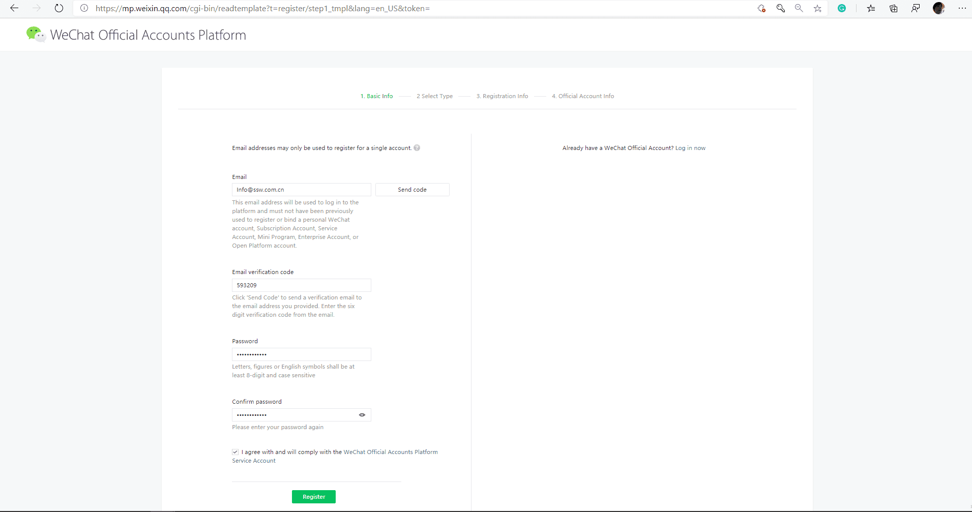 Figure: Fill in with required information – each email address can be registered for only one WeChat product which means if you use an email to register WeChat Subscription Account, you can’t use it for WeChat Service Account or WeChat Mini Program registration - Choose where your business is registered