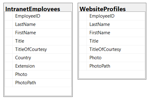 CREATE VIEW vwIntranetEmployees AS SELECT EmployeeID, LastName, FirstName, Title, TitleOfCourtesy, Country, Extension, Photo, PhotoPath FROM Employees; CREATE VIEW vwWebsiteProfiles AS SELECT EmployeeID, LastName, FirstName, Title, TitleOfCourtesy, Photo, PhotoPath FROM Employees;Figure: Good example – Using views from the base table containing the source data