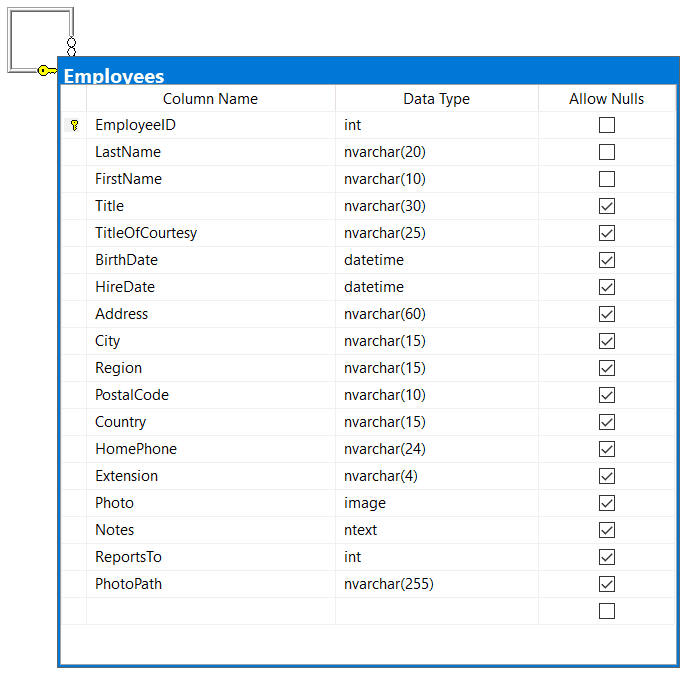 Figure: Northwind traders employees table You could create separate tables for each department, only supplying the required fields for each.This would also need an additional system to sync between the tables to ensure the information was kept up to date.