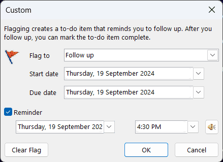 Follow up flags are Outlook's built-in way to set a due date on an email. Add a follow up flag from the red flag icon in the ribbon, or by right-clicking on an email | Follow up. From there you can also set a custom reminder.