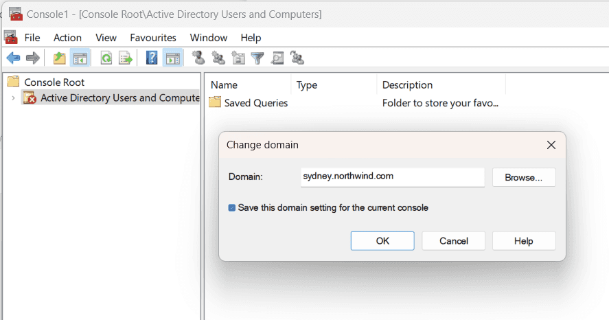 For ADUC (and possibly other tools), you will need to specify the domain to connect to. Make sure you tick the box Save this domain setting for the current console.