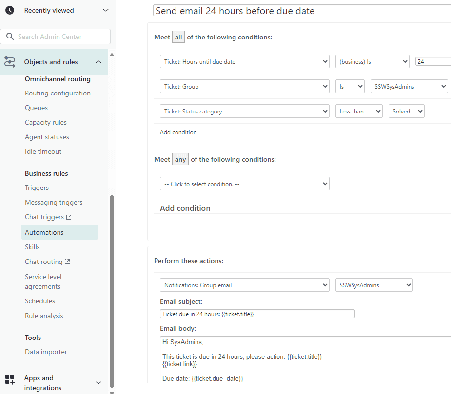Figure: Zendesk Admin Center | Automations | Send email 24 hours before due date