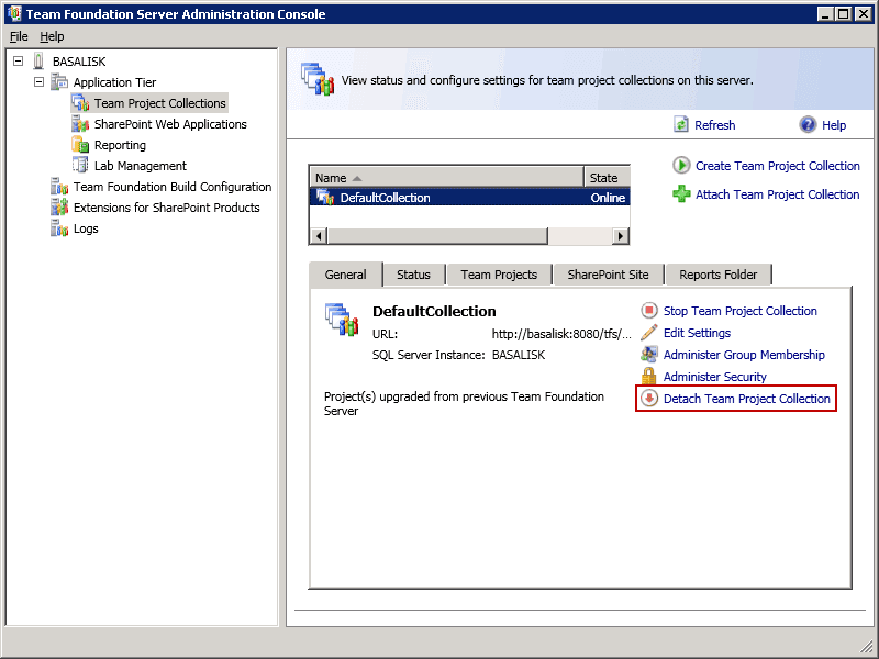 Detach Team Project CollectionFigure: Remove the old Team Project Collection from the server.