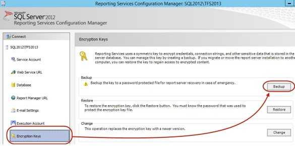 Figure: Backup Reporting Services encryption keys More steps will be required to integrate your SharePoint site and set up your Build servers.